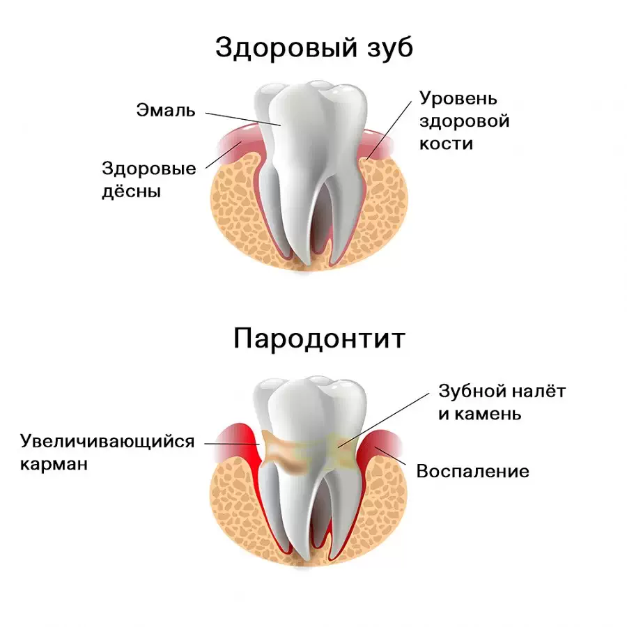 Комплекс тканей, окружающих зуб и удерживающих его в альвеоле, называется пародонтом. Воспаление этих тканей в медицине называется пародонтитом. По мере прогрессирования, это заболевание разрушает связки зуба и костную ткань челюсти. В дальнейшем зубы начинают расшатываться и выпадают, на фоне чего могут возникать абсцессы и свищи.